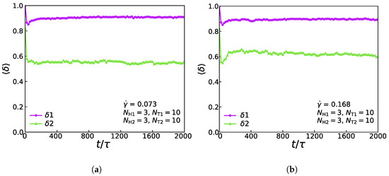 Figure 8 shows the relationship of the shape factor (two types of lipids) for the asymmetric membrane with , , , and in the cases of and . In the weak shear flows with , as shown in Figure 8a, the first type of lipid molecule is like a rod due to its initial configuration, which means that the initial value of the shape factor is 1.0. Soon there is a rapid drop and a slight rise back to a stable value of around 0.9, which exposes that when the simulation reaches equilibrium, the first type of lipid molecule’s shape is still like a rod. However, the shape factor of the second type of lipid molecule’s initial value is around 0.81, which is following its initial configuration. The shape factor increases first and then stabilizes at around 0.6, signifying that the chain exhibits an elliptical formation at the stable stage. Figure 8b shows the change of shape factor value with time step under the strong shear flow with . By comparing the shape factors under the strong and weak shear flows, we can conclude that the shape factors of the first type of lipid molecules are approximately equal under two conditions of shear flows, while the value of the shape factors of the second type of lipid molecules under the strong shear flow is greater than that under the weak shear flow. This phenomenon indicates that different shear strengths will affect the shape of the second type of lipid molecules distinctly, while the shape of the first type of lipid molecules is more stable than that of the second type. We can notice that the result is similar to the previous simulation works [40].