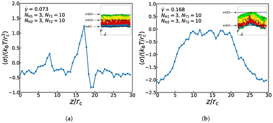 Figure 9 exemplifies the interface tension as functions of distance along z-direction for the asymmetric membrane with , , and in the two cases of = 0.073 and = 0.168. At z = 8.5 and z = 20.0, there is an appreciable change of the surface tension, while the change direction is opposite. These two points are the junctions of lipid molecules and the aqueous solutions, so there is an absolute pressure at the interface of the lipid membrane and the aqueous solutions towards the internal direction of the membrane. Between z = 12.0 and 19.0, the interfacial tension increases and decreases rapidly. In a state of equilibrium, the symmetrical bilayer structure is tensionless, while the internal stress of the asymmetric membrane is caused by the intrinsic stress of the bilayer structures, which is from the different packing of the two layers [60]. Since the two layers must have the selfsame areas in a flat bilayer structure, the different layers will be compressed or stretched to achieve suboptimal layer thicknesses, which will result in the internal stress of the asymmetric membrane structure. Therefore, the interfacial tension reaches a maximum value at the interfaces between the two layers. When the surface tension value is close to 0, it follows that except for the junctions of several particles, the other positions are basically in a pressure-free state. For the asymmetric membrane under the strong shear flow, Figure 9b demonstrates that surface tension’s value begins to rise and reaches a stable stage () between z = 10.0 and z = 20.0, and then decreases to the initial value, indicating that there is almost no pressure inside asymmetric membrane under the strong shear flow. This result is also consistent with the previous experimental results of asymmetric membranes‘ pressures [70]. Differential stresses are caused by suboptimal layer packing densities [60]. In the asymmetric double-layer structure, if the quantity and type of lipids are balanced appropriately between two layers, the intrinsic stress also can be generated. However, under the strong shear flow, the spontaneous curvature of membrane structure is relatively large, the suboptimal packing density of the layer can not reach the state of equilibrium, so its intrinsic stress is almost zero. The resultant force on the membrane interface molecules is not equal to zero, and its resultant force direction is perpendicular to the interior of the membrane structure. As a result, the surface of the membrane tends to shrink automatically, so there is still a certain tension at the interfaces between the solution and membrane. This result confirms the previous work in understanding the non-directional transport of asymmetric membranes in the zero flows [29].