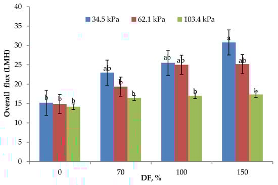 Overall flux means (n = 3) obtained from the lab-scale studies. All experiments were conducted at 24 °C and 800 mL feed was concentrated to a final volume of 200 mL resulting in a fourfold volume reduction (VR). DF is diafiltration water added, measured as a percentage of original feed volume. a,b Means not sharing the same letter are significantly different (p < 0.05).