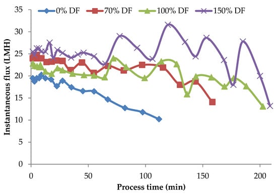Instantaneous flux obtained from the lab-scale studies at 34.5 kPa pressure. Instantaneous fluxes are arrived at by measuring the permeate at various time intervals over the entire process run and averaging for that time interval. All the experiments were conducted at 24 °C and 800 mL feed was concentrated to a final volume of 200 mL resulting in a volume reduction of 4 (VR). DF is the percentage of diafiltration water based on the original feed volume.