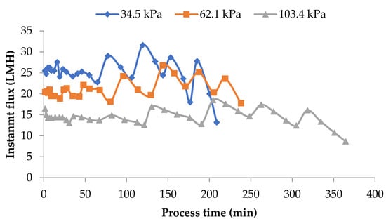 Data presented in Figure 4 shows the impact of operating pressure on flux rates. From the data presented, the operating pressure showed a strong impact on the flux. The flux at all time intervals was about 50% higher for process runs that used 34.5 kPa pressure when compared to the run that used 103.4 kPa pressure. As highlighted in the earlier sections, MF is a pressure-sensitive process. Higher pressures promote a more pronounced polarization of the membrane. Furthermore, there is a compaction of this layer and the membrane leading to reduced flux. In the 103.4 kPa case, these phenomena may be overshadowing the advantage of DF, thereby maintaining the difference in flux among the three pressures used in the study.