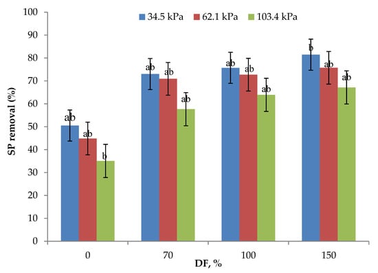 Serum protein removal data from the experiments are presented in Figure 5. Without DF, SP removal ranged from 35 to 50%, the highest being for 34.5 kPa and the lowest being for 106.4 kPa pressure. The statistical analysis of data showed that the SP removal obtained at 34.5 and 62.1 kPa TMP at 0, 70, and 100% DF were not statistically different (p > 0.05). At all the levels of DF, SP removal decreased with increases in the operating pressure. As discussed in the preceding sections, concentration polarization and compaction of the polarized layer, as well as the membrane, may determine the membrane permeation characteristics [,] and mask the beneficial effect of DF at higher operating pressures. The use of 70% DF at 34.5 kPa gave the same SP removal rate as that of 100% DF at 62.1 kPa pressure. Additionally, 100% DF at 34.5 kPa pressure gave a similar SP removal rate as compared to 150% DF at 62.1 kPa pressure. The highest SP removal of 81.45% was obtained with the use of 34.5 kPa pressure and 150% DF. These results highlight the importance of the selection of an appropriate operating pressure and level of DF for maximizing SP removal. A similar trend was found by Hurt and Barbano when studying the processing conditions of MF to remove SP []. They reported that increasing the DF and CF 5× led to an elevation of SP removal from 88.66 to 99.47%.