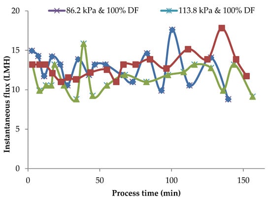 Instantaneous flux obtained for 86.2 kPa TMP at 100 and 150% DF and for 113.8 kPa and 100% DF. The data are from the pilot plant run.