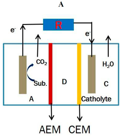 The significant benefits of treating wastewater imply the use of a coupled BES that operates efficiently and has negative energy consumption [22,23,24]. Bio-electrochemical coupled systems (BECS) are very important and efficient in several processes including wastewater treatment, heavy metal removal, desalination, and chemical production [22,24,25,26]. In recent years, several BECS such as the microbial desalination cell–microbial electrolysis cell (MDC–MEC), microbial fuel cell–microbial electrolysis cell (MFC–MEC), and constructed wetlands–microbial fuel cell (CW–MFC) have been developed [22,24,25,26]. BECS enhance the performance of an individual bio-electrochemical system (BES). The MDC–MEC coupled system is a typical BECS that is a very self-sustaining system that improves the operations and performances of the individual MDC and MEC systems. The MDC–MEC coupled system is comprised of a microbial desalination cell (MDC) that powers a microbial electrolysis cell (MEC) for processes such as gas and chemical production and heavy metal reduction. The MDC is a three (3) chambered system that treats wastewater, desalinates saline water, and generates power as shown in Figure 1. MEC is usually powered by an external power supply as seen in Figure 2. Exoelectrogens in the anode chambers of these bioreactors produce electrons by oxidizing carbon sources (including glucose and acetate) as described in Equations (1) and (2). The production of electrons by exoelectrogens is a key component in the MDC–MEC coupled system for the current generation, desalination, and heavy metal reduction [17,27].