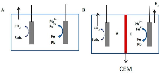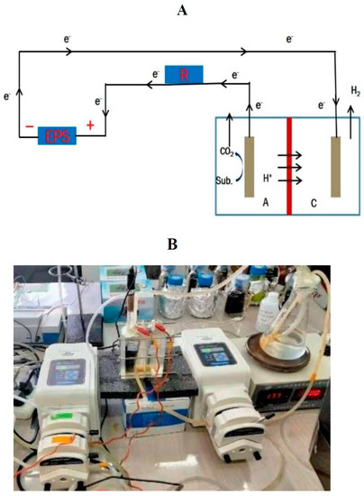 The cubic plexiglass dual-chambered MEC (DCMEC) reactor was made up of anode (162 mL) and cathode chambers (108 mL). The cubic plexiglass single-chambered MEC (SCMEC) reactor had a total working volume of 270 mL. The anode and cathode were carbon electrodes with a projected surface area of 17.25 cm2 (6.9 × 2.5) with the anode having carbon used as electron collectors. The electrodes were also pre-treated with H2SO4 overnight and heated for an hour to activate the surfaces. The electrodes were connected to titanium wires that served as links between the electrodes and the lead connectors. The reactor was connected to an external power supply (0.4–1.0 V) to determine its performance. The cathode was connected to the negative terminal of the power supply, while the anode was connected to the positive terminal through a 10 Ω resistor (a decadence box 0.1–9000 Ω). A cation exchange membrane (CEM, CMI-7000, Membranes International Inc., Ringwood, NJ, USA) was used to separate the anode chamber from the cathode chamber in the dual-chamber MEC. The exchange membrane was pre-treated with NaCl (15 g/L) for at least 24 h and then rinsed with deionized water.