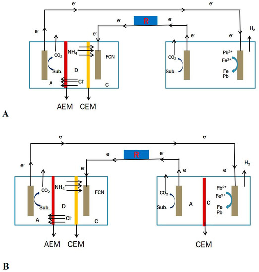 Several heavy metals have been removed from wastewater using MEC [22,28,29,30] but the performance of the two major types of MEC in this process (DCMEC and SCMEC) have not been evaluated. In this study, lead (Pb) and iron (Fe) were reduced in the two MEC systems. The reduction potential (E°) of Pb and Fe are −0.13 V and −0.45 V as shown in Equations (3) and (4). For Pb and Fe to be reduced at the cathode of the MEC, the MDC needs to reduce the cathode potential of the MEC to below −0.5 V experimentally. Desalination is a key component of the MDC-MEC coupled system. The current generation is influenced by desalination in the middle chamber of the MDC. High saline water (seawater or brackish water) or wastewater with high salinity can be desalinated in the MDC. In this study, NH4Cl was desalinated in the MDC. The current generated through desalination and substrate oxidation is supplied to the MEC, hence, maintaining a self-sustaining system. This study will help in the scaling-up of the MDC–MEC coupled system.