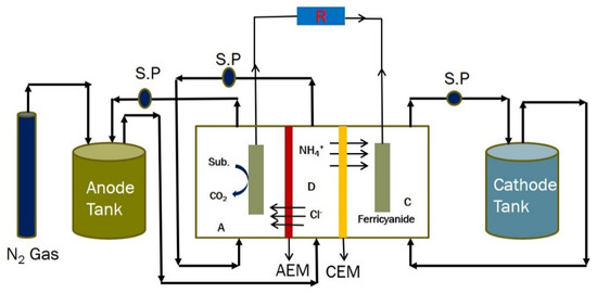 The MDC anolyte was prepared with the following composition: glucose 2.0 g/L; NH4Cl 0.05 g/L; NaHCO3 0.05 g/L; NaCl 0.15 g/L; MgSO4·7H2O 0.01 g/L; CaCl2 0.006 g/L; K2HPO4 10.713 g/L; KH2PO4 5.24 g/L; and 1 mL of trace elements [31] (Liaocheng Yuanze Chemical Co. Ltd., Liaocheng, China) in 1 L of deionized water. The desalination chamber contained 5 g/L of NH4Cl. Two (2) different catholytes, namely ferricyanide (K3[Fe (CN)6])-MDCF and 100 mM of potassium phosphate buffer-MDCP100 were used to determine the power generation and ammonium removal efficiency of the MDC.