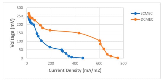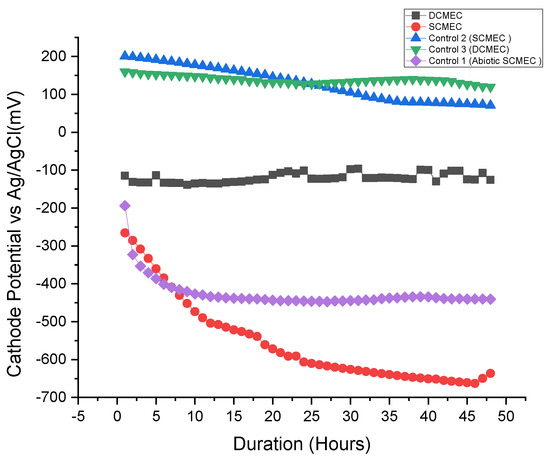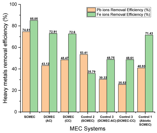 Two main removal mechanisms of Pb2+ and Fe2+ were seen in the MEC systems: (1) microbial biosorption and (2) cathodic reduction potential. Microbial biosorption involves the ability of microbes to accumulate heavy metals from wastewater through metabolically mediated (by the use of ATP) or spontaneous physicochemical pathways of uptake (not at the cost of ATP) [28,34,35,36]. The microbial biosorption was determined by placing Pb2+ and Fe2+ in the anode chamber of the DCMEC. The cathodic reduction potentials of Pb2+ and Fe2+ are −130 mV and −450 mV, respectively, as stated in Equations (3) and (4). Figure 6 describes the efficiency of various MEC systems in removing Pb2+ and Fe2+. The cathode potentials of the SCMEC, DCMEC, Control 1 (abiotic SCMEC), Control 2, and Control 3 during their 48 h of operation are shown in Figure 7. SCMEC had Pb2+ and Fe2+ removal efficiencies of 74.61% and 85.05%, respectively, with a corresponding cathode potential of −549 mV vs. Ag/AgCl, while DCMEC had Pb2+ and Fe2+ removal efficiencies of 48.47% and 72.91% respectively, in the cathode chamber with a corresponding cathode potential of −120.9 mV vs. Ag/AgCl. The SCMEC had the highest heavy metal removal efficiency within 48 h and higher than the DCMEC, Controls 1, 2, and 3 due to the simultaneous application of the two heavy metal removal mechanisms. The DCMEC had Pb2+ and Fe2+ removal efficiencies of 43.12% and 72.91%, respectively, in the anode chamber, which shows that combining the two mechanisms provides a higher removal efficiency than a single mechanism of heavy metal removal provides. Other research studies confirm the high heavy metal removal in the SCMEC [37,38]. The required electrode potentials to reduce Pb2+ (−0.13 to −0.267 V vs. SHE) and Fe2+ (−0.45 to −0.51 V vs. SHE) were more negative than the anode potentials under open circuit of the DCMEC (−0.212 V vs. Ag/AgCl) and SCMEC (−0.079 V vs. Ag/AgCl). In open-circuit operations, the exoelectrogens are restricted in transferring electrons to the anode. Therefore, exoelectrogens gain energy by transferring their electrons to heavy metals (Fe2+ and Pb2+). The restriction of electron transfer to the anode must have enabled Pb2+ and Fe2+ to be electron acceptors at the anode during the open circuit experiment, resulting in the Pb2+ and Fe2+ reduction in the open circuits [37]. Biosorption also plays a major role in Pb2+ and Fe2+ removal in the open circuits. Control 1, 2, and 3 were performed to determine the efficiency of each mechanism. Control 1 (abiotic SCMEC) had the highest Pb2+ and Fe2+ removal efficiency with a corresponding cathode potential of −425.7 mV vs. Ag/AgCl. This process showed that the cathodic reduction potential in heavy metals removal is more efficient than that of microbial biosorption as metal affinity, saturation of active sites of metal-binding ligands, pH, temperature, inhibitions from by-products, and even the types of heavy metals may affect microbial biosorption [34,35,36]. The general range of pH for metal uptake is between 2.5 and 6. Above this limit, the metal uptake ability of bio-sorbent microbes gets compromised [34,35,36].