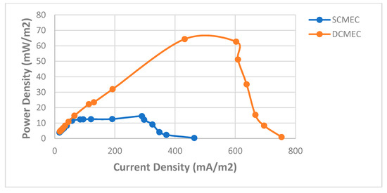 The following are available online at https://www.mdpi.com/article/10.3390/membranes11090661/s1, Figure S1: Current and Power Densities performance of the SCMEC and DCMEC at 10 Ω within a 48-h cycle; Figure S2: COD removal efficiencies and Desalination in MDC over 8 fed-batches as a power source to the MEC systems.