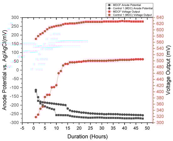 The anode potential and voltage output of the MDCF and Control 1 as a power source within a 48-h cycle.