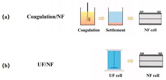 - Wang, J.; Tang, X.; Xu, Y.; Cheng, X.; Li, G.; Liang, H. Hybrid UF/NF process treating secondary effluent of wastewater treatment plants for potable water reuse: Adsorption vs. coagulation for removal improvements and membrane fouling alleviation. Environ. Res. 2020, 188, 109833. [Google Scholar] [CrossRef]