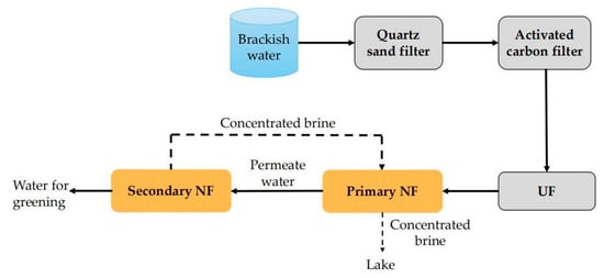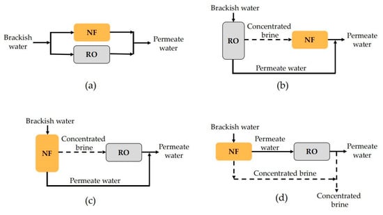- The application of NF technology integrated with other emerging water treatment technologies is expected to further improve the performance of brackish water treatment. For instance, an integrated NF-calcite contactor process proposed by Haddad et al. was proved to be a feasible method to effectively remove the undesirable compounds (particularly manganese (Mn), iron (Fe) and hardness) from groundwater [139]. Therefore, more novel hybrid brackish water treatment process combination with NF as core should be explored.