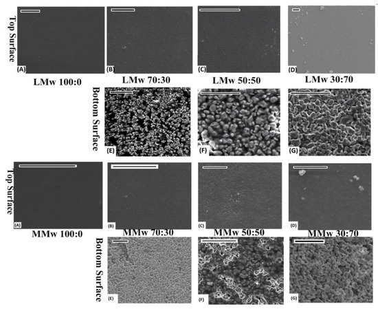 SEM performed on LMW and MMwCH:HA membranes. Top and bottom surface of 100:0, 70:30, 50:50 and 30:70 ratios of CH:HA. All images scaled at 20 µm. (A–D) are top surfaces of LMw and MMw Neat and composite membranes. (E–G) are bottom surfaces of composite LMw and MMw membranes.