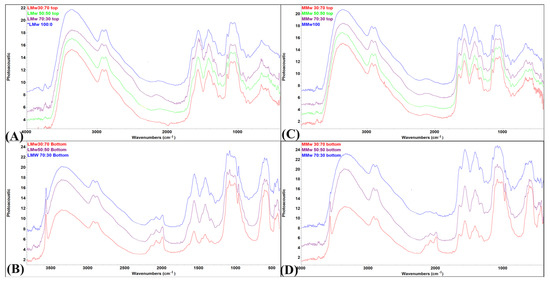 FTIR-PAS spectral profile of (A) low molecular weight (LMw) 100:0, 70:30, 50:50 and 30:70 obtained from the top surface; (B) LMw 70:30, 50:50 and 30:70 obtained from the bottom surface; (C) medium molecular weight (MMw) 100:0, 70:30, 50:50 and 30:70 obtained from the top surface; (D) MMw 70:30, 50:50 and 30:70 obtained from the bottom surface.