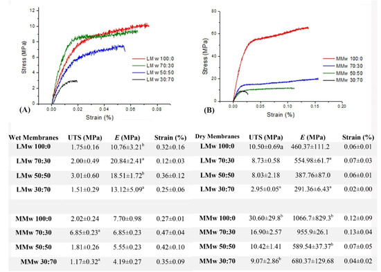 The correlation of stress to strain. (A) Representation of the LMw composite membranes in wet conditions, (B) representation of the MMw composite membranes in dry conditions. Results of the tensile test are shown in the table, values are a mean ± SD (n = 6). Ultimate tensile strength (MPa), Young’s Modulus (E) or Elastic Modulus (MPa) and Strain (%). Similar superscripted letters in the same column indicate statistical significance (p < 0.05).