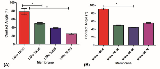 Water contact angle analysis of (A) LMw and (B) MMw neat and composite membranes 70:30. 50:50 and 30:70. The graphs show mean ± SD (n = 3), (*) indicates statistically significant difference. LMw 100:0, 78° ± 6; LMw 70:30, 50°± 1.6; MMw 90° ± 3; MMw 30:70, 55° ± 1.6; MMw 50:50, 45° ± 1.