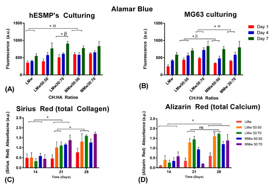 Cytotoxicity conducted via culturing (A) hES-MP and (B) MG63s. Cellular viability analysed with Alamar blue staining until day 7. Values shown are taken from mean ± SD where n = 3. (C) Collagen and (D) calcium accumulated by hES-MPs at day 14, 21 and 28. (ns, no statistically significant difference, α and β represent statistically significant difference in between the observed groups). (*) indicates statistically significant difference.