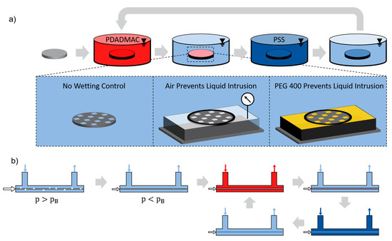 Further, polyelectrolytes tend to remain near fluid–fluid interfaces due to their often amphiphilic nature. To create such a fluid–fluid interface for polyelectrolyte enrichment in a first coating step, we induce a fluid–fluid interface inside the pores by controlling the wetting state of the support structure. The wetting state can be controlled via back-pressure control of air, or immersion of a pre-wetting agent. To obtain a stable interface, pore-filling fluid must effectively prevent the coating solution from intruding the pore throat. In turn, the applied pressure on the pore-filling fluid may not exceed the breakthrough pressure of the pore-filling fluid. In this case, a constant flow of air or pre-wetting fluid would prohibit the formation of any pore-spanning layer. Hence, no net flow of air or pre-wetting fluid across the membrane may occur.