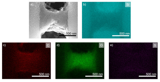 Further evaluation of the polyelectrolyte bridge structure was conducted using energy-dispersive X-ray spectroscopy (EDX) measurements. For samples with three bilayers of PDADMAC/PSS, signals for silicon, carbon, and oxygen were found (see Figure S2). For seven bilayers of PDADMAC/PSS, results are displayed in Figure 7. Here, an additional sulfur signal strong enough for automatic detection was found that can be accounted to the contained PSS. The detected silicon signal can be attributed to the support structure, whereas the carbon signal can clearly be attributed to both of the polyelectrolytes. Oxygen can in general be found in both, the native oxide layer of the support structure, and the polyanion PSS. The native oxide layer on the support, however, was very thin and only causes some background signal, while the oxygen signal is much more prominent in the area of the polyelectrolyte complex. Hence, we concluded that this signal could be used for a localisation of PSS. Additionally, the sulphur signal was attributed to the contained PSS in the polyelectrolyte structure due to its chemical composition.