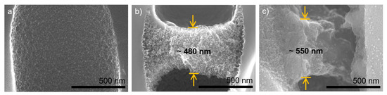An additional factor biasing the layer thickness results displayed in Figure 9 is the different shrinking behavior by polyelectrolyte deswelling inside the pores due to the nanoconfinement of the pore walls. In Figure 8b,c, the textures of the polyelectrolyte complex structures appear different. Furthermore, the structure in Figure 8c is ruptured, whereas the structure consisting of three bilayers appears to be intact. This difference in shrinking behavior might have a significant influence on the visible layer thickness in FESEM imaging. An exemplary visualization is given in Figure 3 on two neighbouring pores.