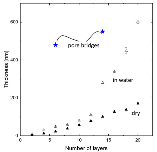 PDADMAC/PSS layer thickness on silicon wafers in function of number of coating steps measured by ellipsometry (triangles) in aqueous environment and air-dried as well as pore-bridging layer thicknesses taken from Figure 8.