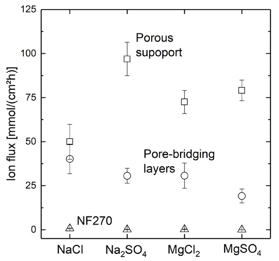 The ion flux resulting across the membrane is displayed in Figure 10 for the porous support with three bilayers of PDADMAC/PSS with a fully water-wetted support (conventional dip-coating), the porous support containing pore-bridging polyelectrolyte complexes after three bilayers of PDADMAC/PSS-coating, and a commercial NF270 nanofiltration membrane for reference.