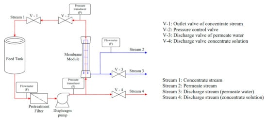 A thin-film composite (TFM) membrane (GE-1812, SUEZ Water Technologies and Solutions, Budapest, Hungary) was used for all concentration experiments by RO process. It is a commercial spiral wound-membrane module that has an effective area of and theoretical NaCl rejection rate of 99%.