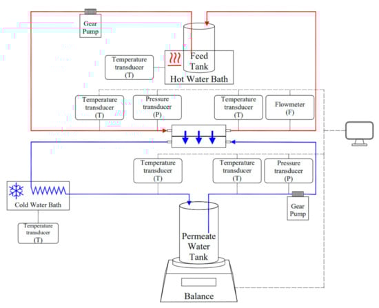 Direct contact membrane distillation (DCMD) was the default MD configuration applied in this study. The experimental set-up is shown in Figure 2. The feed and permeate streams circulated at a flowrate of 0.20 L/min in counter-flow direction by gear pumps (WT3000-1JA, Longer Precision Pump Co., Ltd., Baoding, China). Transducers of temperature (CWDZ11, Beijing Star Sensor Technology Co., Ltd., Beijing, China) and pressure (CYYZ11, Beijing Star Sensor Technology Co., Ltd., Beijing, China), as well as flowmeter (GTGF04F1M2B, Anhui Jujie Automation Technology Co., Ltd., Wuhu, China), were installed along the streams, with measurements automatically recorded in the connected computer.