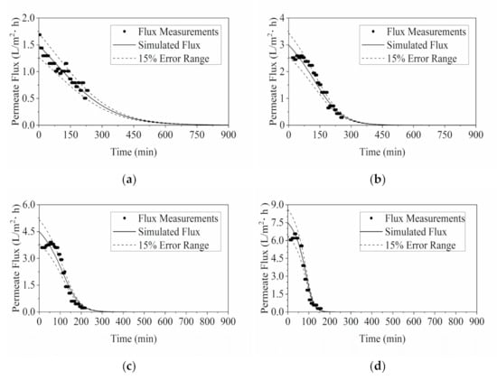 Validation of RO model via comparing the simulation results of permeate flux with the flux measurements taken during the experiments with different operating pressures: (a) 0.3 MPa; (b) 0.45 MPa; (c) 0.6 MPa; and (d) 0.9 MPa.