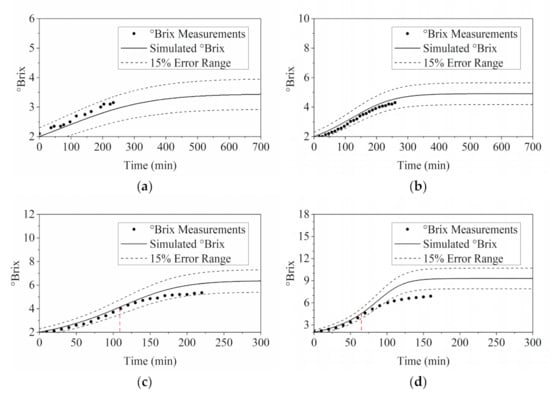 Validation of RO model via comparing the simulation results of °Brix with the °Brix measurements taken during the experiments with different operating pressures: (a) 0.3 MPa; (b) 0.45 MPa; (c) 0.6 MPa; and (d) 0.9 MPa.