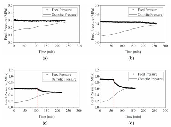 Profiles of operating feed pressure (MPa) and osmotic pressure (MPa) in RO experiments with different initial operating pressures: (a) 0.3 MPa; (b) 0.45 MPa; (c) 0.6 MPa; and (d) 0.9 MPa.