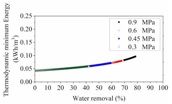 Thermodynamic minimum energy for RO concentration processes with different operating feed pressures.