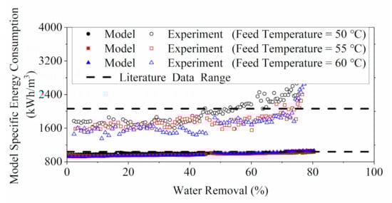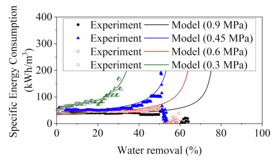 As shown in Figure 7, the model SEC at different feed pressures demonstrated similar trends in which the energy consumption increased mildly at the start and then underwent a steep rise at the threshold feed concentration (i.e., water removal).