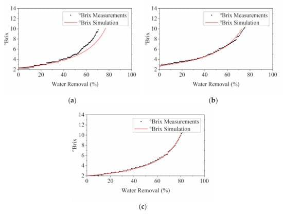 The comparison between the simulated °Brix profiles and experimental °Brix measurements is presented in Figure 4. The °Brix profiles exhibited similar trend as the flux analysis in Figure 3. Most of the experimentally acquired °Brix measurements were in decent agreement with the simulated results, lying within the 15% deviation range. Conversely, discrepancies were observed in the tests of 0.6 MPa and 0.9 MPa at approximately 109 and 65 min. This corresponded to the observations of foaming as mentioned above. Foaming caused unanticipated flux reduction, consequently leading to a lower °Brix value than the simulated results with faster water removal rates.