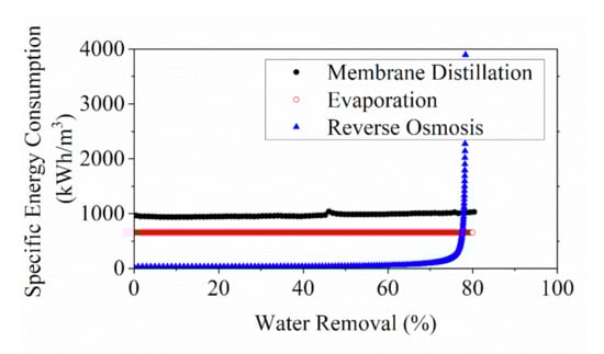 The intention was to develop models that can estimate the energy consumption of membrane concentration processes (i.e., RO and MD) with changing feed properties. The energy evaluations of the membrane processes were compared with that of a conventional thermal evaporation process via a single stage evaporator, enabling a direct visualization of the concentration process by membrane-based technology in contrast to the conventional concentration process. This can be critical for the process design on the extent of pre-concentration by membrane-based concentration [24].
