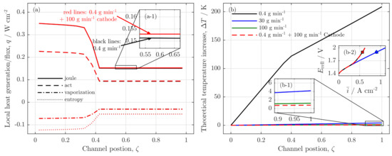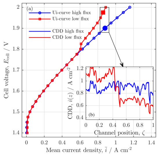 Figure 5a shows the experimentally observed current density profiles and Figure 5b the simulation results for the same cell voltages and flow rates. In the experimental analysis, the current density was measured at 252 measurement points along the long channel coordinate (experimental data from [5]). For the simulation, only 20 points along the z-axes were chosen and presented on the normalized channel position, .