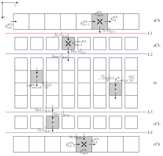 In Equations (1)–(3), the electron potential field in the aCL is described. Here, the electron flux density crosses the imaginary interface between PTL and aCL, referred to as L1 in the following. The positive sign in the nomenclature always indicates a flux into a control element at a particular boundary, whereas a negative sign describes a flux out of an element. Furthermore, the electron flux is distributed along each channel coordinate, represented by the index k (s. also Figure 2).
