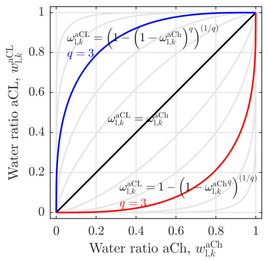 Second, the coupling function between the channel and the CL water ratio is introduced. Here, Equation (40) shows a right-bent trend (s. Figure 3, blue line), for which the liquid phase ratio of the channel is always smaller or equal to the CL liquid phase ratio ():