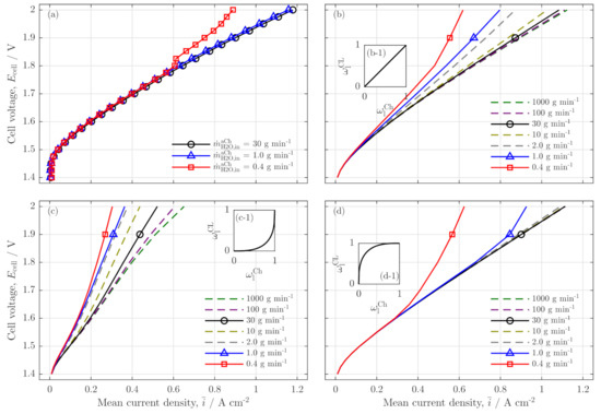 Polarization curves of (a) the experimental study (data from Immerz et al. [5], brief description of the experimental setup in Appendix C) with anode inlet water flow rates of , and and (b–d) the model results for those flow rates as full lines with markers with different coupling functions (e.g., Equations (40)); (colored, dashed lines as additional flow rates). (b) linear coupling of liquid phase ratios (s. inset (b-1)), (c) left-bent coupling (s. inset (c-1)) and (d) a right-bent coupling (s. inset (d-1)) for ; temperature , ambient cell pressure .