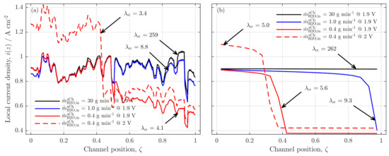 A quantitative difference between the model and experiment is the stoichiometric water ratio at which the current density profile begins to drop. While the experimental results show a homogeneous profile for , the model data already reached a critical level and began to drop in the cell’s outlet region.