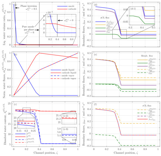 In the dissolved water model, solely dissolved water fluxes are assumed to cross the internal MEA boundaries (e.g., ). Only across boundary L1, liquid flux densities are considered as .