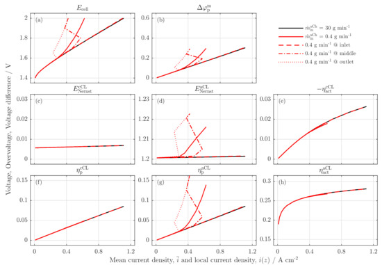 In contrast, the right-bent coupling (s. Figure 4d and inset (d-1)) adequately resembles the experimental measurements. First, for high water stoichiometry (s. black circle line) the polarization curve is identical with the experimental data and does not change much for a wide range of flow rates (s. dashed lines for ). Furthermore, the low flow rate polarization curves (, blue line; , red line) show the experimentally observed strong and sudden deviation from the common trend, when a critical stoichiometry is reached.