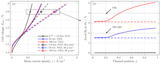In Equation (14), the Nernst potential of the anode side is dependent on the dissolved water concentration as educt, (s. Equations (27)–(29)) and the dissolved oxygen concentration as product, (s. Equations (17)–(19)). On the cathode side, only the dissolved hydrogen concentration as product is taken into account (s. Equations (A26)–(A28)). In Equations (14) and (15) , and represent the reference concentrations of liquid water, oxygen and hydrogen, respectively, given in Table A3 and Equation (A9). For the anode half cell, a temperature correction of the reference Nernst potential (s. ) is shown in Equation (A1), while the cathode reference Nernst potential is defined as [16].