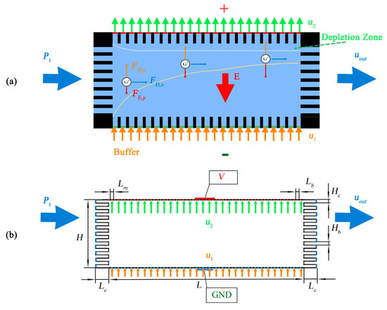 We use a simplified model for our simulation study, as shown in Figure 1b. In this model, the chamber is of length L and width H. At the left and right sides of the chambers, there are a number of microchannels of length Lc and width Hc. On the upper and lower boundaries of the chamber, there are a series of barriers of length Lb (representing the barrier between microchannels in Figure 1a), the distance between, which is Lm (representing the microchannels). We apply a constant inlet flow of u1 and a constant outlet flow of speed u2 at the location of the microchannels on the lower and upper boundaries, respectively. This treatment is based on the fact that the electroosmotic flow has the plug shape in a microchannel, and the concentration of the solution in the lower and upper sides is different. At the inlets of microchannels at the left side of the chamber, constant pressure of P1 is applied. At the outlet of microchannels on the right side, a constant flow speed uout is set.