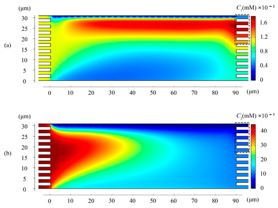 On the outlet boundaries of microchannels at the right side, (i) the free boundary condition is applied for mass transport; (ii) the fluid flow speed is the constant :
