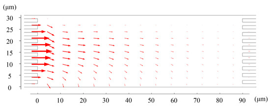 In this simulation, the geometric parameters of the chamber are L = 90 μm, H = 31.5 μm (see Figure 1b). The length of the microfins channel is Lc = 3 μm, and the width is Hc = 1.5 μm, while the distance between the channels is Hb = 1.5 μm. The length of membrane segments is Lm = 1.5 μm, Lb = 1.5 μm.