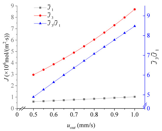 As shown in Figure 6, when the horizontal speed uout increases, the Mg2+/Li+ flux ratio increased. Although the flux of Li+ ions increases, there is not enough time for Mg2+ to reach the downside reservoir, resulting in a significant rise in the average flux of Mg2+ and poor separation effect, specifically reflected in the increase in the Mg2+/Li+ flux ratio.