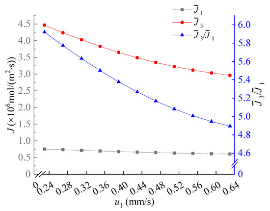 The dependence of the average flux of Li+, the average flux of Mg2+ and the Mg2+/Li+ flux ratio on u1. Values of other parameters are: V = 30VT, uout = 0.5 mm/s, u2 = 1 mm/s, 18 μm ≤ y ≤ 31.5 μm, x = 96 μm.