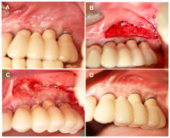 Overview of treatment stages. (A) Initial clinical view of area encompassing sites #23 to #26 after implant loading. PI-KM width = 1 mm. (B) Intraoperative view of aCM placement and fixation on the periosteum. (C,D) Soft tissue healing in area encompassing sites #23 to #26, 10 days postoperatively (C) and 6 months postoperatively (D).