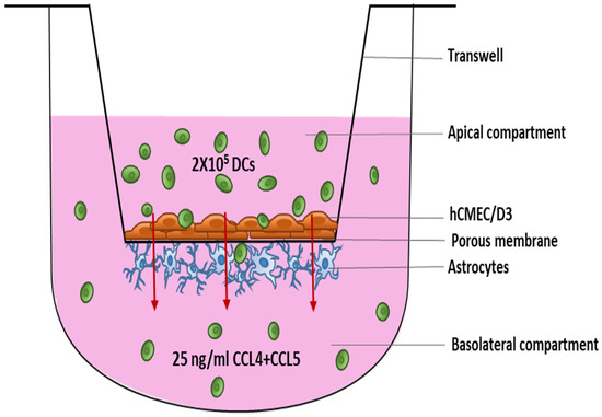 Schematic overview of the DC migration experiment using an in vitro model of the BBB. Endothelial cells were seeded on top of the 3.0 µm porous membrane in a 24-well transwell with astrocytes on the underneath. BBBs were maintained in culture for 10–12 days before the migration of DCs was studied. Abbreviations used: BBB—Blood–brain barrier, DC—Dendritic cells.